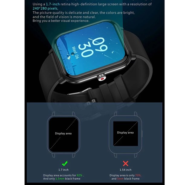 Product details Specification   Display screen: 1.7 inch TFT high-definition, 240*280pixel CPU: Realtek8762x Touch: Full screen touch Colour:  black,  blue, Pink, orange Material Body:  PC+ABS     strap: Silica gel Bluetooth:  BLE5.0 Heart rate sensor:  VC11 R5 G-sensor:  STK8321 Battery:  200mAh...View more