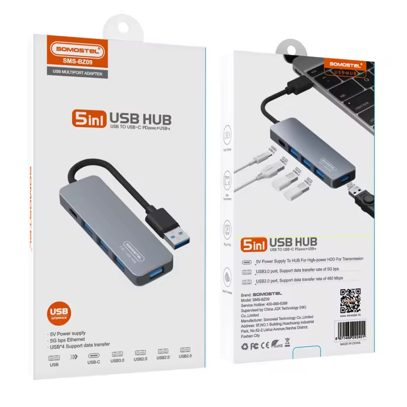 Somostel SMS-BZ09 5 in 1 USB HUB TO USB-C PD 60W high speed 5 port PD charging usb 3.0 Multiport Adapter